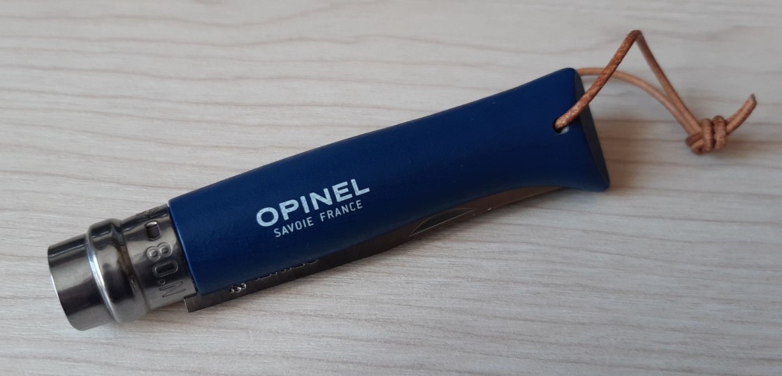 Клинок Опинель №8 по геометрии напоминает турецкие ятаганы – у него гладко заточенное лезвие и поднятое практически до линии обуха острие. Длина лезвия равна 85 мм. Клинок довольно тонкий – 1,5 мм и подойдет для точных аккуратных разрезов. В качестве материала лезвия, в Opinel №8 используется нержавеющая сталь. Это марка 12C27, которая производится по традиционным шведским технологиям. Такая сталь объединила в себе два важных свойства: коррозийную стойкость и твердость. Поэтому Опинель №8 как нельзя лучше подходит именно для полевого использования.