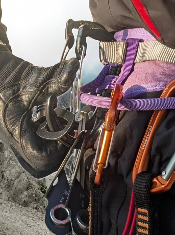 Карабин устанавливается на пояс беседки или привязи в специальный слот, помогает разместить и упорядочить снаряжение или инструменты при переноске.