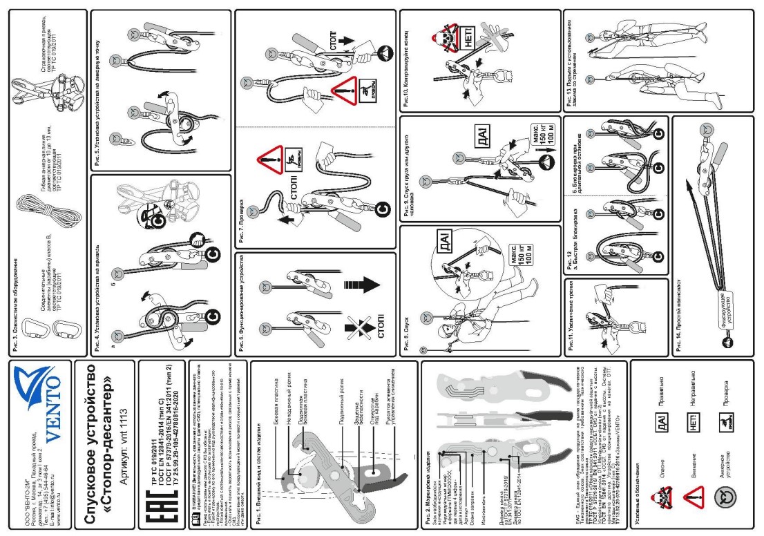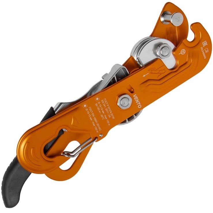 Устройство для спуска и позиционирования на канатах. Подходит для спусков в безопорном пространстве. «Стопор-десантер» может применяться в качестве второго фиксирующего устройства при непродолжительном подъеме по веревке совместно с жумаром и стременем.Стопор присоединяется к привязи через карабин. При этом веревка устанавливается и вынимается из устройства без необходимости его снимания с привязи. Подвижная пластина устройства имеет открывающуюся скобу для фиксации на карабине. Канат закладывается в одной плоскости, что гарантирует минимальное скручивание веревки при длительных спусках. Рекомендуется использовать на канатах Ø 10-12 мм «Высота» и «Профистатик» ТМ VENTO (ГОСТ EN 1891/А).